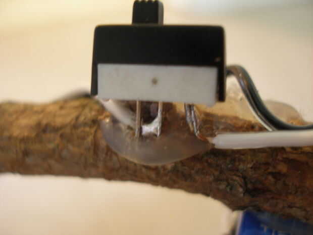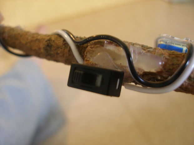 Coloqué el botón derecho donde sería mi pulgar, esta colocación es suya. Más atrás con un interruptor permite ocultar la electrónica completamente en su palma. Para asegurar el botón, utilice un poco de pegamento caliente.