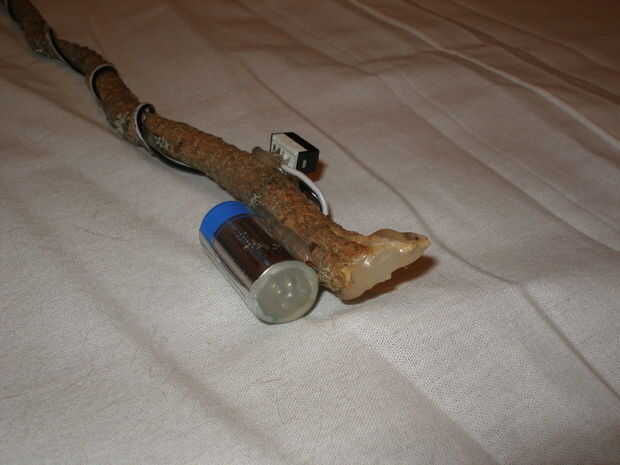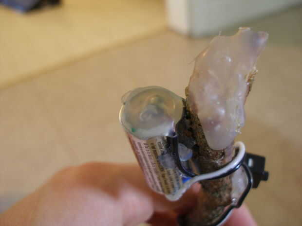 Una vez que una conexión sólida, virar la conexión con una gota de pegamento caliente para asegurarse de que permanezca conectado. Esto es probablemente el punto más débil de su varita, así que asegúrese de que está bien protegido.