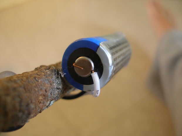 En primer lugar, inserte el cable apropiado en el orificio de ventilación del extremo positivo y gírela. Esto hace que la soldadura a un mínimo. A continuación, fije la batería a la barra con una pequeña línea de pegamento caliente. Por último, tome el cable negativo y doblarla de forma que toque el polo negativo de la batería.