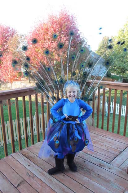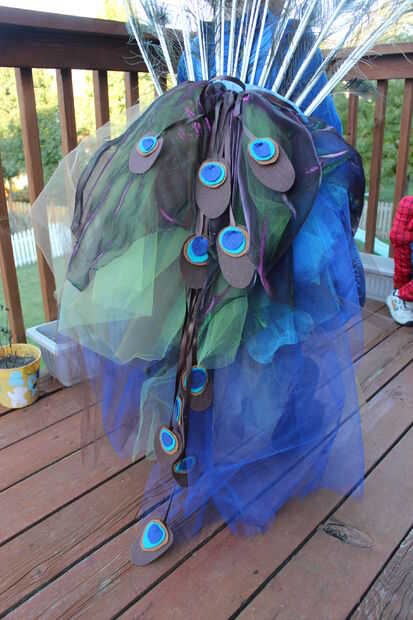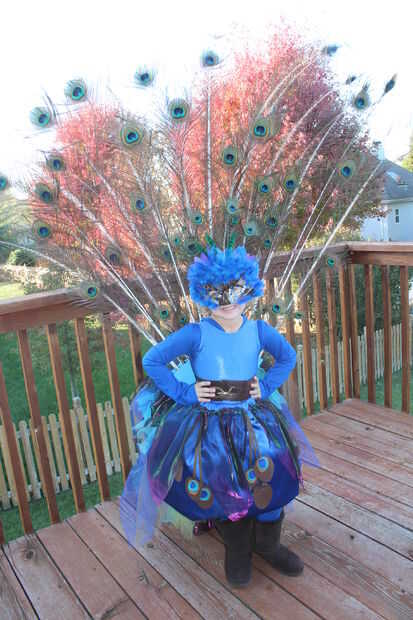 -Hemos utilizado una tela de raso azul, con tul interior para dar hace full extra y algún color brillante cambio de tela Halloween para crear el tutú. Corte marrón, azul y turquesa para parecerse a los ojos de la pluma y había atado con cinta color marrón.