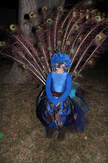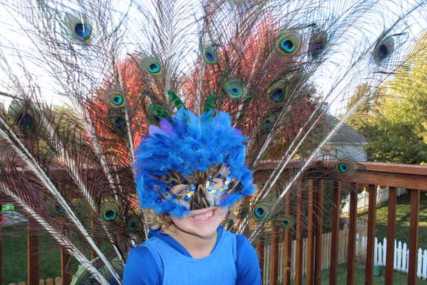 -Encontramos una máscara barata con plumas marrones y moradas en una tienda de dólar. Mi hija pegados en algunas plumas lentejuelas azul de una boa de plumas viejas y atamos unas plumas de peacoack para completar la máscara.