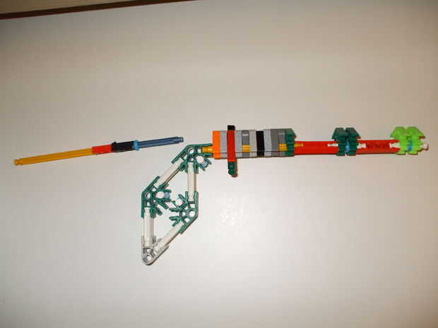 Hello !Esta es mi nueva arma: mi versión de la AK - 47 (la llamé "AK - 48"...) con un sistema elástico! Los brotes de pistola con mecanismo de slingshoot y es muy potente-Munición: Conector rojo-Pequeño-Fácil de recargar-Bueno realmente gatilloE