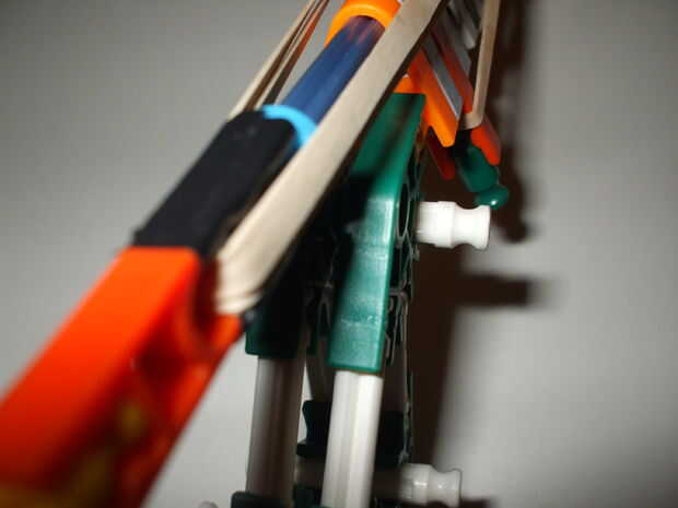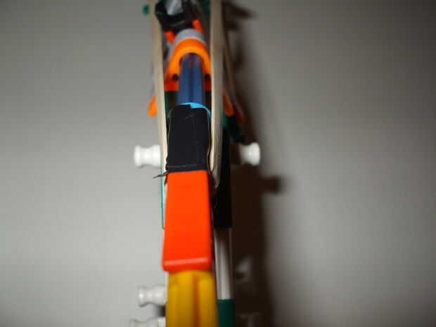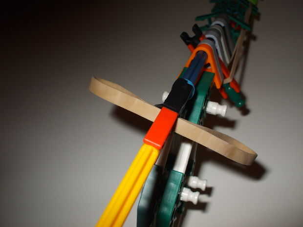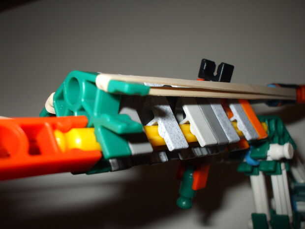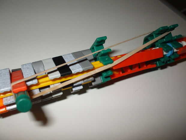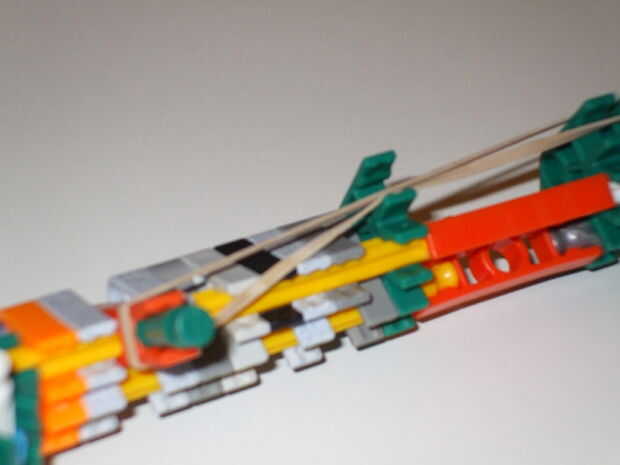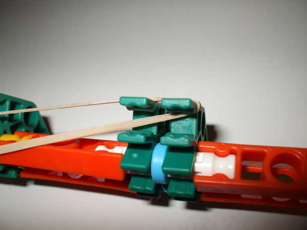 Debe usar 2 gomas muy fuerte pero puede utilizar los normales y hay uno con el otro normal elástico para que el disparador automáticamente haga clic en su lugar cuando usted tire hacia atrás el percutor.