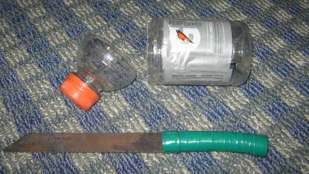 Uso cuchillo o sierra y cortan la parte superior de la botella.