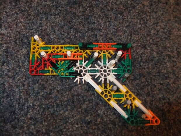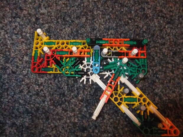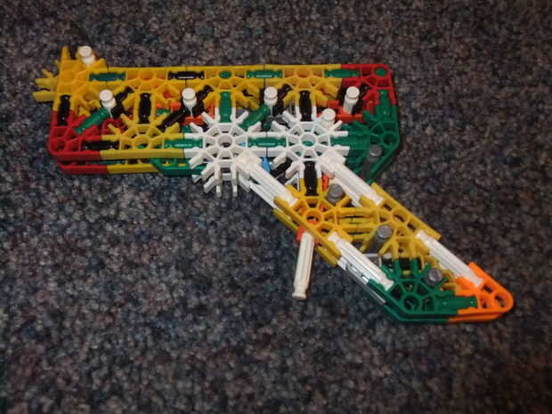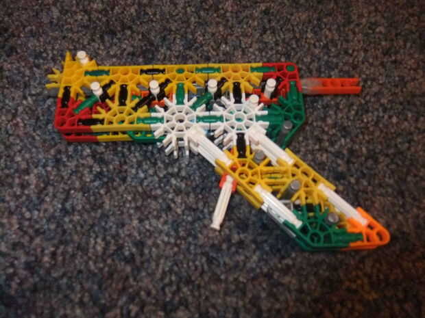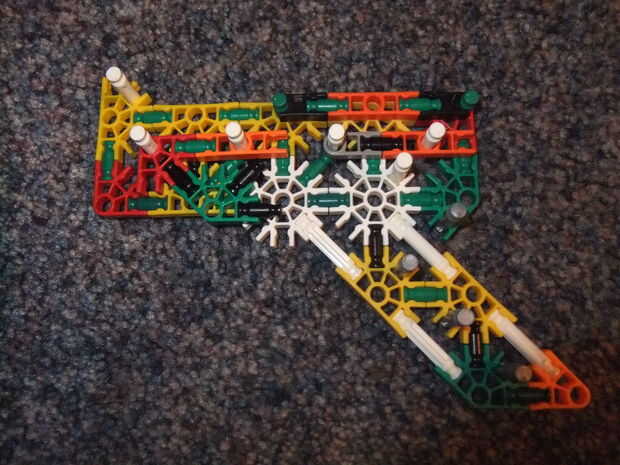 esta es mi arma favorita de K'nex construido por la propia. es una foto única pero puede ser muy potente dependiendo de cuántas gomas le agregue es el mecanismo de disparo. Me gusta porque hace buen uso de piezas de flex. Trabajar la pistola tirando