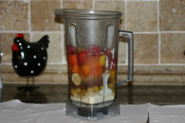 Poner todos los ingredientes con el yogurt en la parte inferior, por lo que es más fácil de mezclar. Luego llene la licuadora con agua a la parte superior de todos los ingredientes.