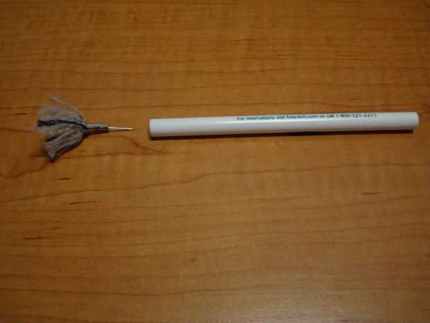 Ahora toma tu dardo terminado de golpe y empuje en el tubo de la pluma. A veces ayuda a torcerse el dardo introducir en el tubo. Una vez que el dardo se inserta completamente en el tubo, coloque los labios alrededor de ese mismo extremo del tubo y sopla... asegurándose de que nada importante quede directamente delante del tubo. Ten cuidado, los dardos de golpe pueden ser fotografiados fácilmente a través de la habitación. Y los dardos pueden pegarse en paredes, puertas, piel, ojos, etc....