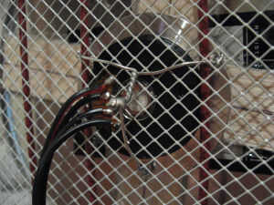 Use algunos metal amarres de alambre o zip para sujetar la rueda en la jaula. No cuenta los cables conectados al eje, los soldados como un experimento (ver al final del post) y son absolutamente no necesario de la rueda trabajar.