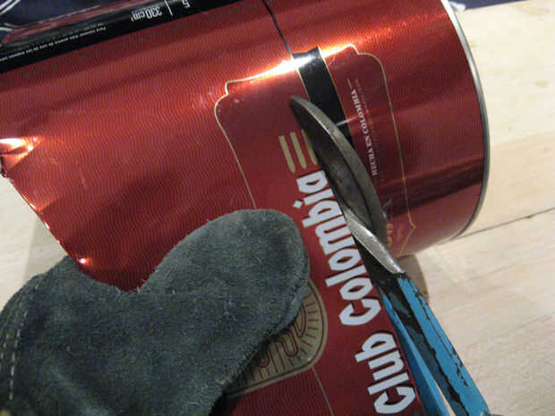 Utilizar un conjunto de tijeras hechos específicamente para el metal a cortar la lata. Si no tienes uno por favor pedirlos, te ahorran mucho tiempo (y es mucho más seguro que usar un cuchillo).