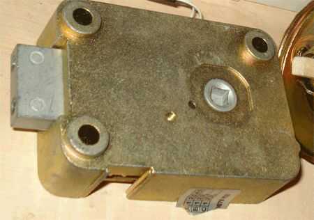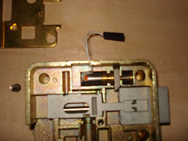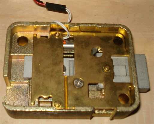 He incluido una foto del interior de la cerradura donde se puede ver cómo funciona: va para el electroimán que tira un pin que libera y libera a una cuña. Esta cuña permite la puerta ser desbloqueado.