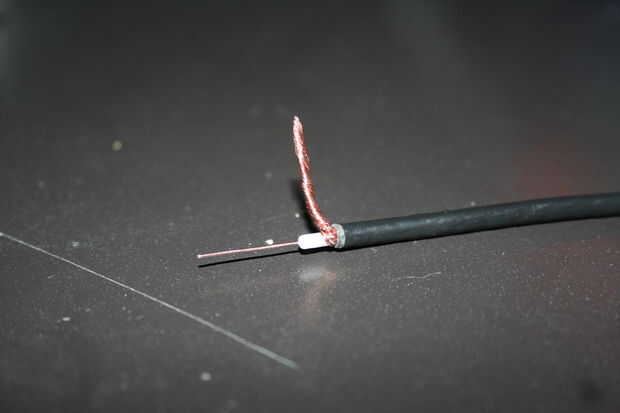En primer lugar, tira hacia atrás el aislamiento exterior del coaxial. Utilizar un buen conjunto de peladores de alambre para hacer esto muy fácil, o cuidadosamente con una navaja.