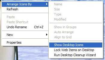 Después de 2 minutos, debe dejar la víctima sabe lo que pasó. Es tan fácil de deshacer como hacerlo. Simplemente haga clic derecho en el escritorio, ir a "Organizar iconos por" y luego haga clic en "Mostrar los iconos de escritorio". La marca de verificación junto a "Mostrar los iconos de escritorio" ahora debe tener un cheque a su lado. Diviértete con esto! = D