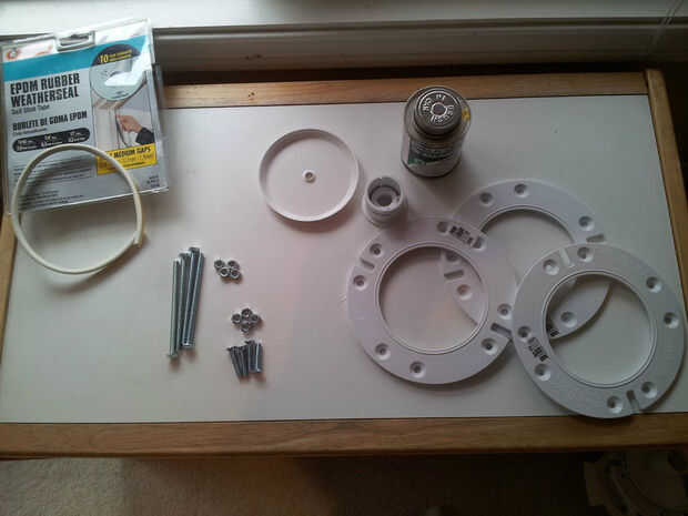 1: 4 "PVC limpiar la placa de cubierta (tiene un pequeño agujero en el centro que será perforado hacia fuera a más o menos coincide con el diámetro interno del buje). Un 5" limpiar hacia fuera de la placa de la cubierta también trabaja y es un poco más fácil pegar (se superpone más). Puede sustituir cualquier cosa plana de PVC que cubre el reborde de apertura.