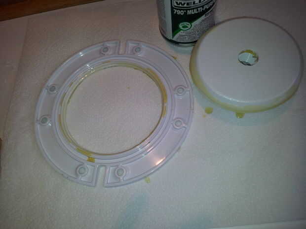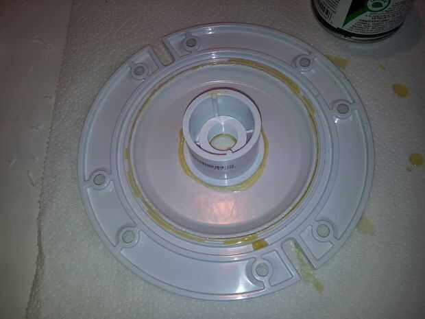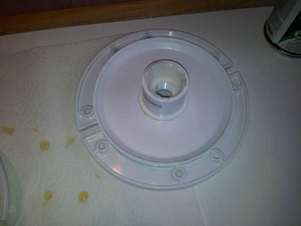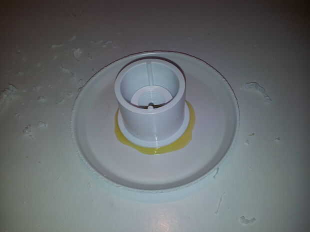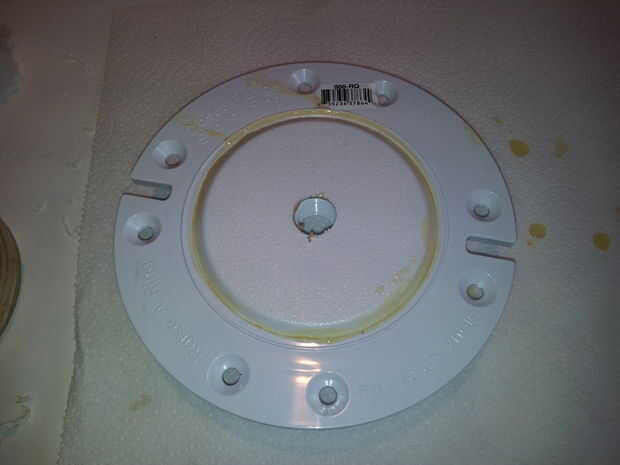 Siga las instrucciones en el cemento para pegar el buje en la placa de cubierta (alinee sus agujeros respectivos).  A continuación pegar la placa de cubierta sobre uno de los extensores de la brida de inodoro.  Asegúrese de que pegue al lado sin los orificios avellanados.  Los orificios avellanados deben ser en la parte superior para que las tuercas que se utiliza para unir los postes verticales (el 1/4 "x 4" tornillos) no sobresalga mucho.  Usar el manguito adjunto como un mango para facilitar buena colocación de la placa de cubierta.  La placa de cubierta de 4" casi exactamente encaja en el agujero de la brida por lo que es un poco complicado.  Uso un montón de pegamento Asegúrese de que no quedan huecos.