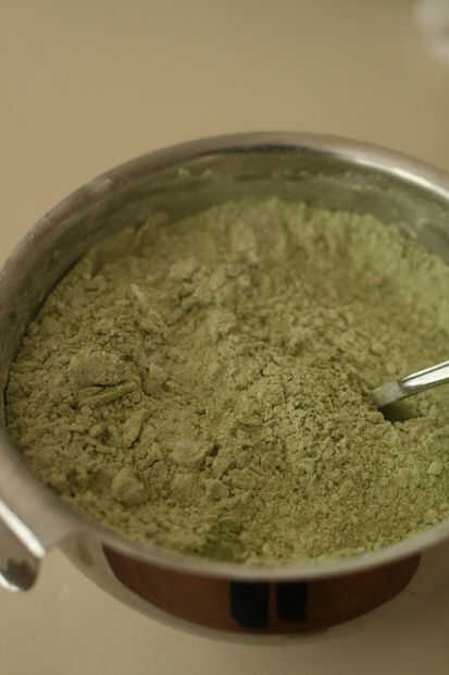 Batir en un bol harina, matcha en polvo, polvo de hornear, bicarbonato de sodio y la sal. Ponga a un lado.