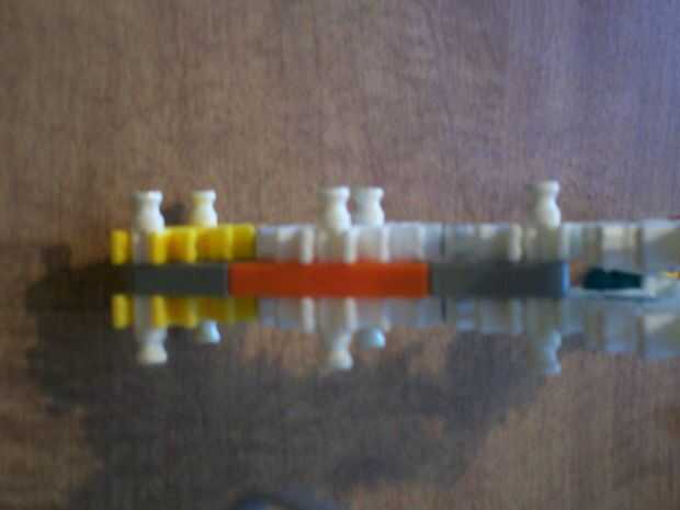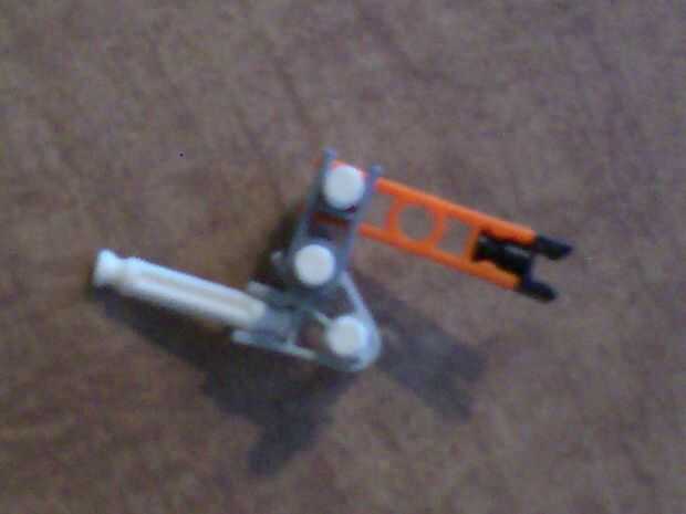 8 y 9. Conecte el conector naranja y negro horquilla pieza en ángulo de 90 grados a los conectores grises atados a la barra blanca.