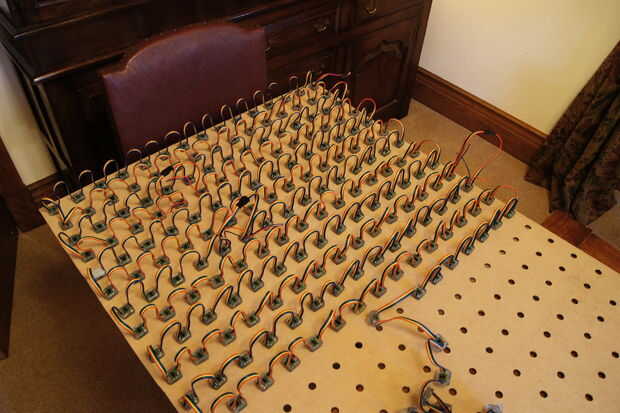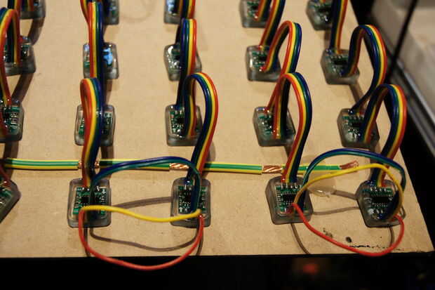 A continuación se que debe añadir una masa común. Este detalle es muy importante, y cuando se hace mal puede ser la causa de muchos problemas de señal. La mejor manera para tener una idea es mirar la segunda foto. Conseguir un alambre grueso (importante porque la caída de voltaje afecta a alimentación y señal) y tira de intervalos (igual a LED espacio) con un cuchillo Stanley (rollo el cable con el cuchillo para cortar 2 círculos, luego cortar una línea vertical entre los dos por lo que se puede quitar la pieza. Ejecutar esto por el lado más largo y soldar los cables a tierra que (usted tendrá que cortar el cable a tierra entre los píxeles).