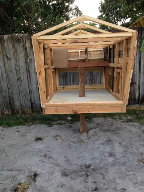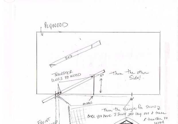 Así que simplemente parado frente a la coop sé que la anchura era de 40 pulgadas. Así que simplemente hice 2 marcas en 40 pulgadas aparte a lo largo de uno de los bordes largos de la madera contrachapada. Luego encuentran el medio y dejó una marca. En la marca media extendió una línea de hasta 15 pulgadas en el que fue mi pico de mi techo. Entonces tomó un 2 x 2 y colocarla sobre la marca y trazó la línea a la madera para obtener los ángulos a ambos lados para cortes. Luego simplemente hacer 5 sets y atornillados todos juntos. No puede sentir muy fuerte, pero una vez atornilladas todo es maldito fuerte. Y el adicionales triángulos largos ver en los picos de las barras de techo que logra sacar en la madera contrachapada y cortando en un pedazo de papel y luego cortar 5 de madera...