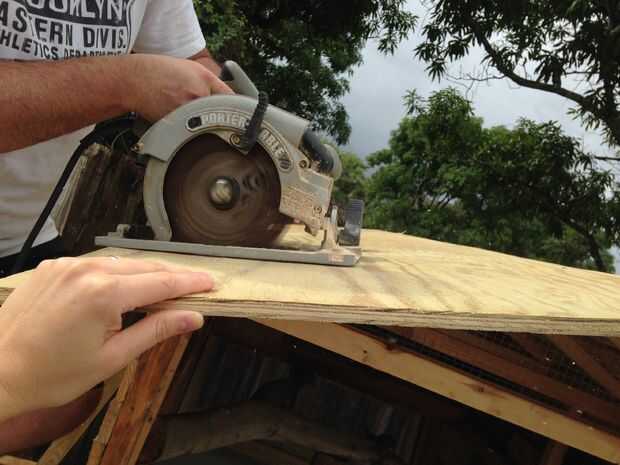 Así que ahora su madera contrachapada maravillosa con todos los planes de llegar al corte lateral derecha por la mitad. Se trata de los paneles de 2 techo que va a utilizar. Yo simplemente cortar por la mitad y alzó un lado y había alineado por el medio en el pico de la azotea y lo mismo con el otro lado y atornillados a las costillas por debajo de.