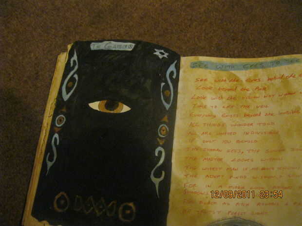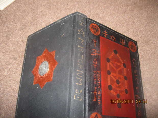 he pintado el diseño en la cubierta de piel de Topo y había lo había barnizado. He encontrado un colgante céltico en mis viajes, esto fue encajado en la parte posterior del libro con un cuchillo para tallar hacia fuera del círculo de stanly y super pegado en.