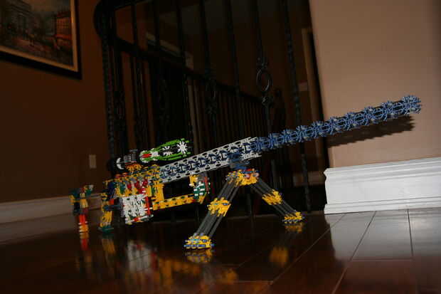esta es un arma de gatling KVG que construyó y es muy fácil de construir y no tiene muchas piezas. Tiene 8 cañones y dispara cerca de 10-20 pies, que no es grande pero tiene un índice del fuego de cerca de 8 cada uno o dos segundos. No es mano por lo