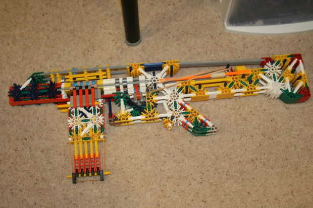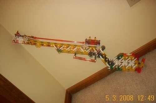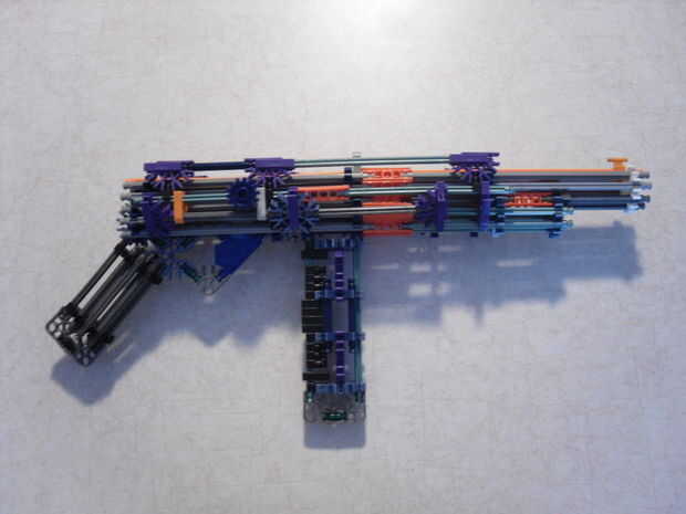It is a though little K'nex gun that I made. Puede tirar una caña de K'nex blanco 8.5 pies (2,57 m). No es grande porque soy nuevo en instructables, pero merece la pena hacer y es bastante simple por lo que sólo toma unos muinets para construir. Perd