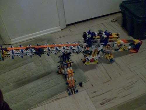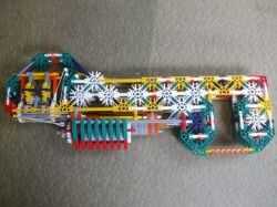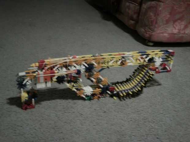 A k'nex gun shaped like the letter "S". O 5. Se hizo porque echaba de menos entrar en el torneo de Jollex y decidió publicar un arma basado en los requisitos del concurso, una pistola con gatillo complejo con partes móviles. Tiene un conector gr