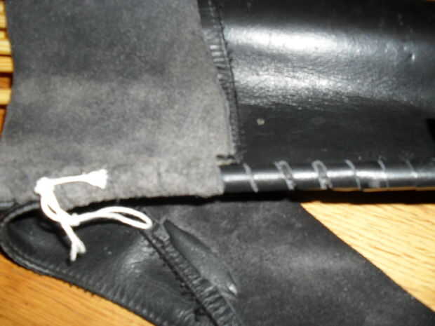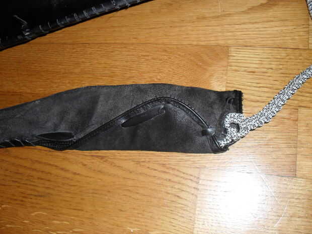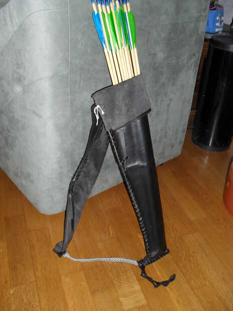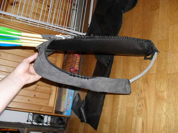 Este "diseño" está hecha de una sola pieza de cuero, con correas de cuero para coser la aljaba juntos y para hacer la pieza de pecho mirando mejor. como refuerzo de la aljaba se coloco 2 limpiar electrodos de soldadura (1 era manera de a poco) en la parte del cosido. de esta manera que la aljaba se mantiene en forma si no hay ninguna flechas en él, esto ayuda mucho cuando poner las flechas de nuevo.