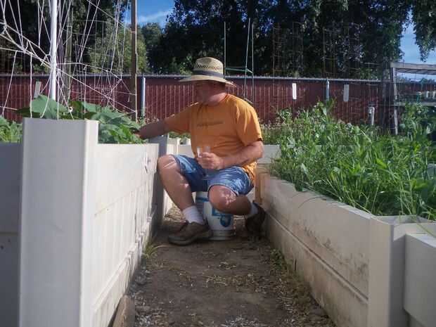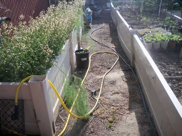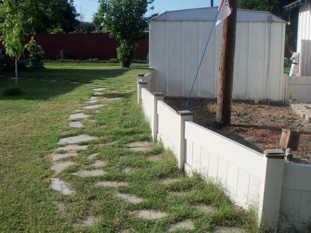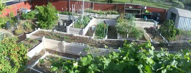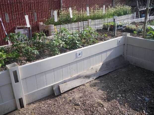 Usé el vinilo reciclado vallado para construir camas de veggie levantado. Son 3 a 4 pies de ancho, 12 a 24 pulgadas de altos y hasta 36 pies de largo.