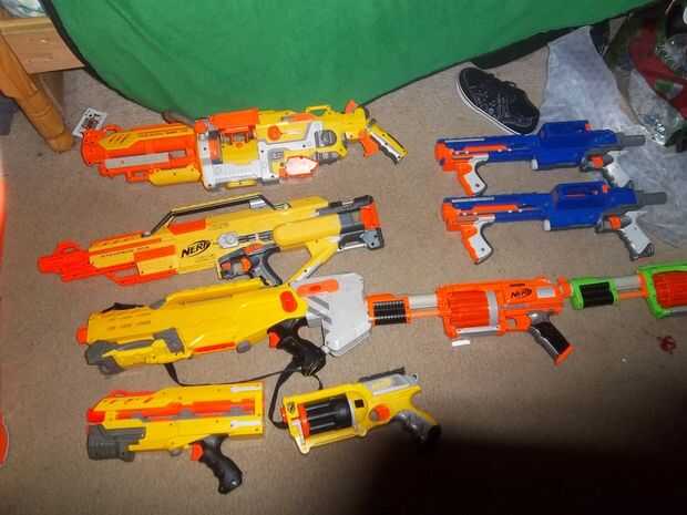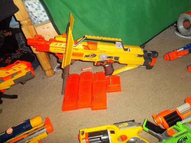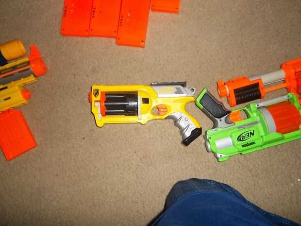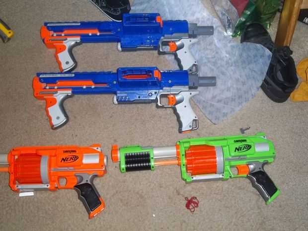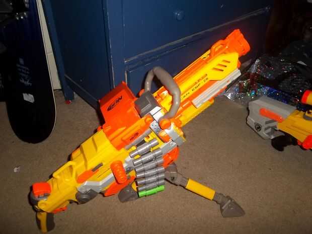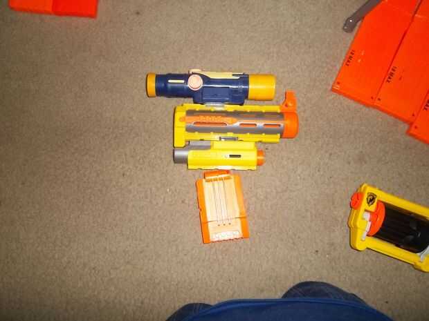 He modificado una Blastzooka extrema BuzzBee para disparar 6 Nerf dardos elite, estilo de la escopeta. Inicialmente lo hizo disparar dardos solo, pero era demasiado poderoso como para dejar que mis hijos utilizan. Deja ronchas en su cuerpo y también