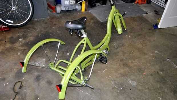 Esta moto se inició como una manera para mí tomar a mi hija en un viaje y aún llevar comestibles o pañales. Nunca me gustó el original color azul oscuro pero vivieron con él. Luego teníamos otro bebé y esta moto se sentaron fuera para unos veranos. Pensé que podría construir una canasta más grande para él y tomar ambos paseos. Pero primero era necesario un cambio de color. La moto se sentía como todo era un cuarto de vuelta muy apretada de fábrica para un completo tira hacia abajo, necesario. Tomé un cojín áspero a las piezas para pintura, limpiado y les deje reposar en el sol antes de la pintura. Rocía unas cuantas capas de pintura y los puso dentro para secar. Es difícil dejar que las cosas en seco durante unos días pero sostuvo fuerte y esperado. Comenzó a poner juntos de nuevo y se sorprendió lo bonito estaba buscando. Esto se está convirtiendo en una moto totalmente diferente de un cambio de color.