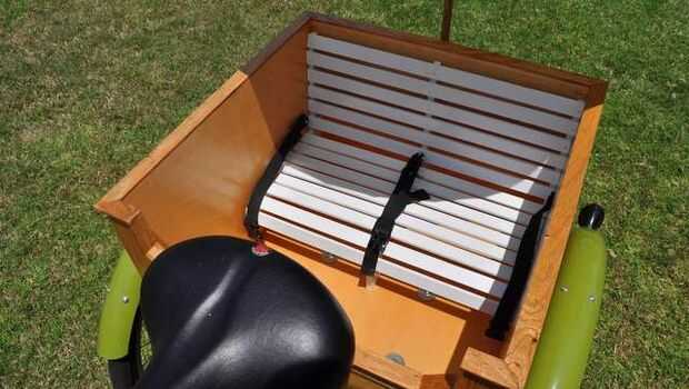 Construido una simple cesta de madera de madera contrachapada, recortado hacia fuera y lo manchado. El siguiente fue el asiento. Arrancó algunas ¼" roble en 1" tiras cortan todo a longitud y cebada y aerosol pintado. Enarenó ligeramente el grano levantado apagado e hizo una capa más. Grapas en cesta y prestado algún tipo de cinturones de seguridad de nuestro carro. Bonito y brillante y el asiento blanco no consigue demasiado caliente al sol.