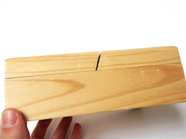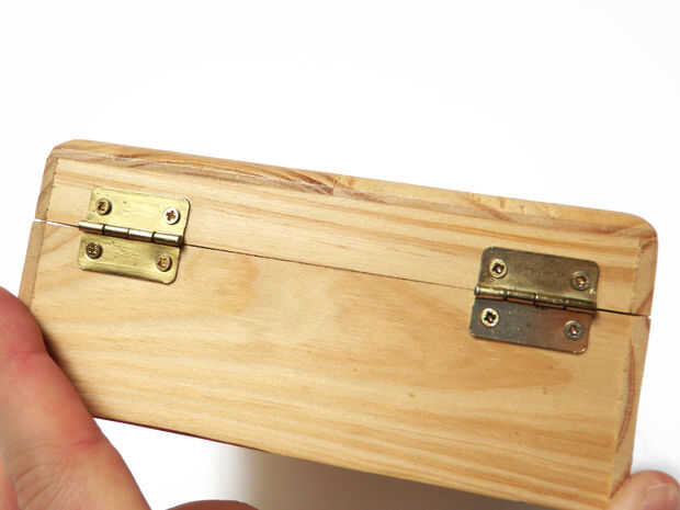 Tengo mi caja de la tela y arte de Beverly y quitó la tapa y aserrado por la mitad en un ángulo de 65 grados. Entonces tomé las bisagras que se sujetan la caja y movido hasta el borde más pequeño que gira libre. El brazo de palanca dentro de la caja también fue adquirido en de Beverly y solía ser una letra decorativa madera (creo que era la letra "J").