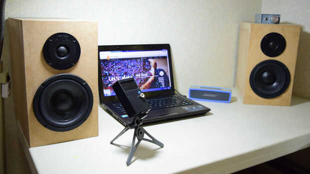 Tengo otra tabla perpendicular a mi mesa de proyecto. Es donde descanso mi portátil. Medida de lo posible, mantener la computadora portátil cerca de mi escritorio de proyecto, facilita la lectura de esquemas y PCBs edición mucho. También tengo mi par de altavoces de estantería de bricolaje en ambos lados del, jugar fuerte todo el tiempo :)