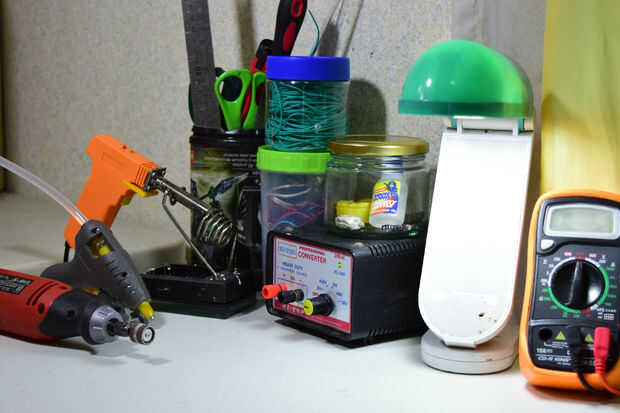 -Cautín, herramienta rotatoria, pistola de pegamento y fuente de alimentación ajustable.