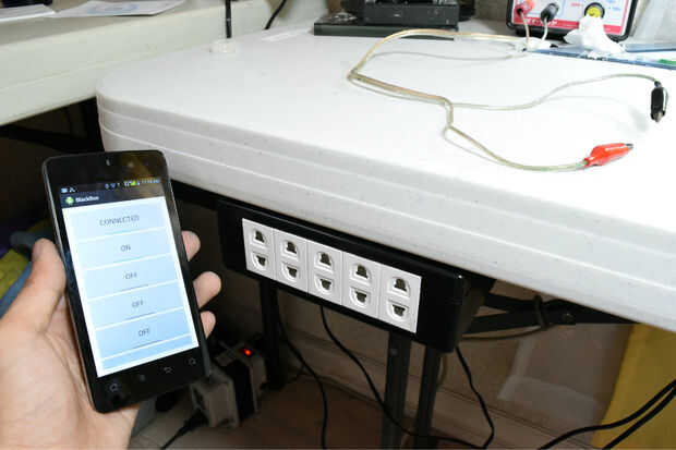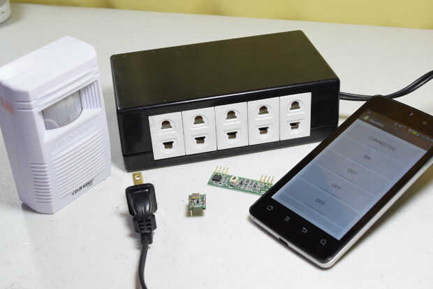La caja de automatización del hogar: El cuadro está compuesto por una matriz de AC sockets, un Arduino Uno, un escudo de relé DIY, un módulo Bluetooth y un bajo voltaje Switching PSU. Cada toma tiene un relé designado, puede ser controlado uno por uno. En cuanto a la detección de movimiento, ya hackeado un barato PIR de alarma timbre mediante la adición de un módulo de RF de baja potencia ($4). El TX (timbre) envía señales a lo RX (caja de automatización del hogar) cuando detecta movimiento.