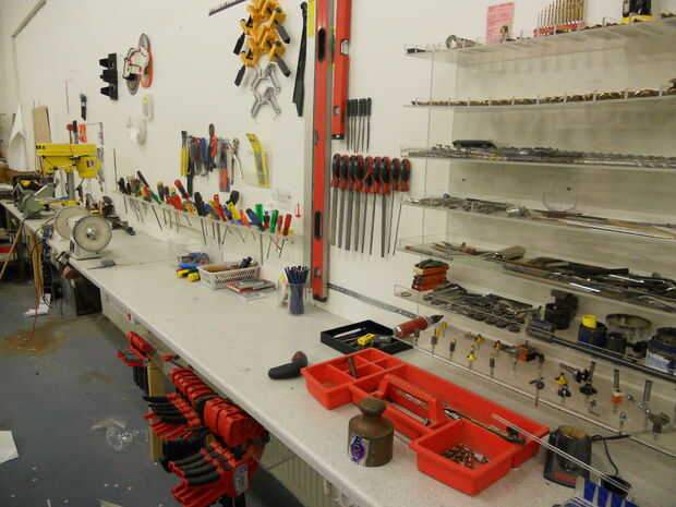 This is my workspace. Yo puedo engañar un poco aquí porque este es también mi lugar de trabajo pero la cosa es que soy dueño de esta empresa y esta tienda toda lo cuando la tienda cierra por las noches y los fines de semana, se convierte como mi enorme garaje... nunca menos, este es el lugar en pasar el rato y construir cosas.