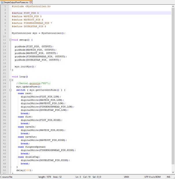Si no te gusta el plan de activación del pin, cambiar la muestra. Si revisas el código (se adjunta), verá que es bastante sencillo cambiar qué pines se activan por que gesto. Solo tienes que cambiar la define por arriba.