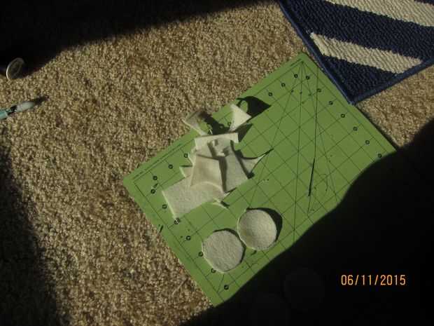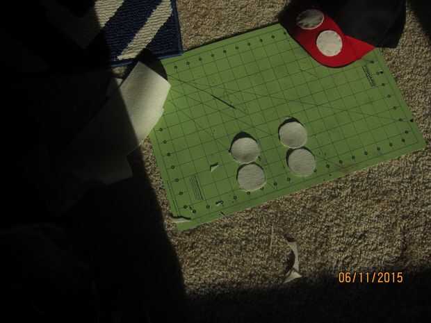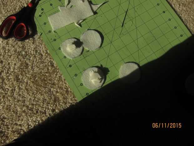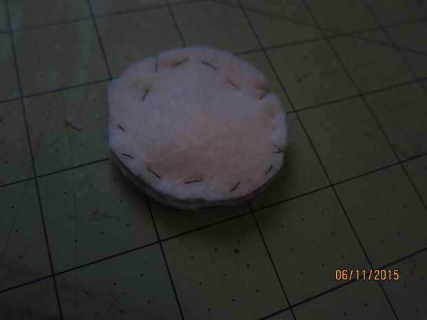 Utilizando un objeto circular rastro 4 piezas de fieltro hacia fuera y recortarlo. Una vez que tengas todo el corte de círculos se puede poner un pequeño montón de izquierda sobre fieltro y coser a otro círculo de inicio. Necesitas 2 de estos oídos.