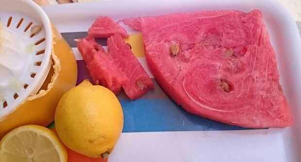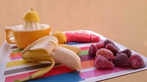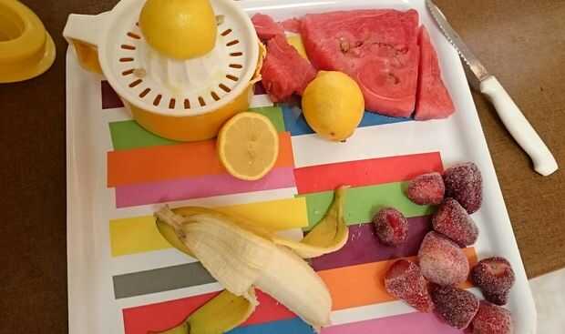 la mitad del plátano, sandía, fresas (yo pongo 9), jugo de limón (1 y 1/2) y una cuchara de mermelada de fresa