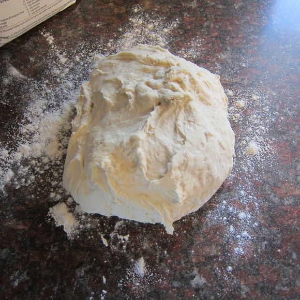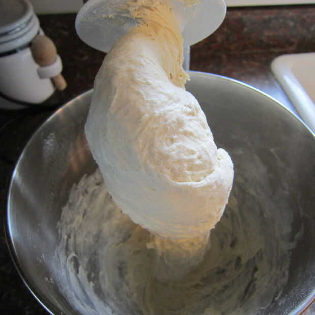 1. disolver la levadura en agua tibia en un bol grande y dejar reposar durante 5 minutos. Agregue 3 tazas de harina y la sal, revolviendo hasta que esté suave. Agregar un adicional de 2 tazas de harina; seguir añadiendo harina (hasta 1/2 taza), 1 cucharada a la vez, revolviendo hasta que la masa sale del tazón de fuente pero todavía pegajosa.