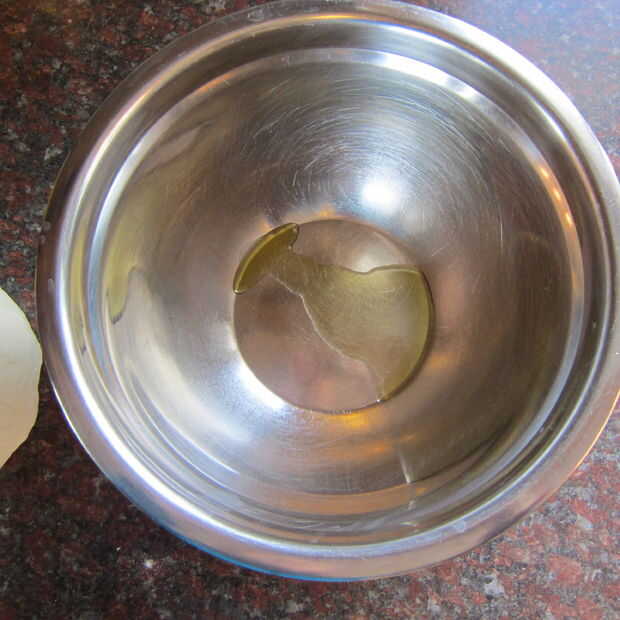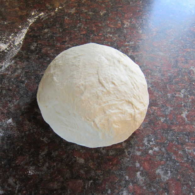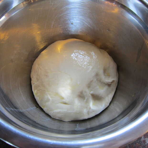 3. forme la masa en una bola y la transferencia a un recipiente ligeramente aceitado; Gire a la capa. Cubrir con plástico y deje reposar en un lugar cálido hasta que doble en volumen, 3 horas. Presione con el dedo para ver si se hace; debe seguir un guión.