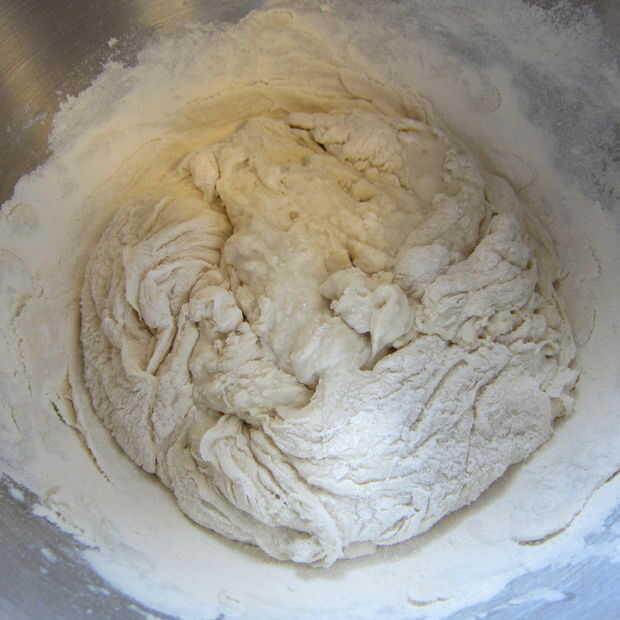 2. Desenroscar la masa sobre una superficie de trabajo ligeramente enharinada y amasar con las manos ligeramente enharinadas. Comenzar golpeando la masa sobre el mostrador, tirando de él hacia usted con una mano y empujando lejos de usted con la otra. Doblar la masa sobre sí misma (utilice un raspador de banco o un cuchillo ancho para ayudar a raspar la masa de la superficie). Repetir hasta que sea más fácil de manejar, unas 10 veces. Acabado normalmente amasando hasta obtener una masa lisa, elástica y suave pero un poco hortera, unos 10 minutos.