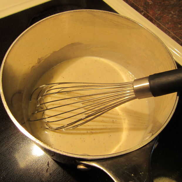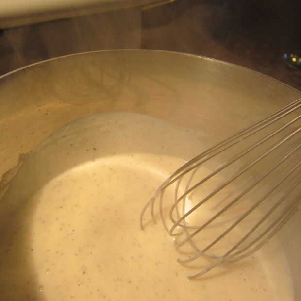 Agregar cebolla en polvo, pimienta y leche entera. Bata hasta que la mezcla se espesa y puede cubrir los lados de la olla cuando inclina.