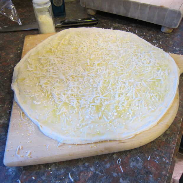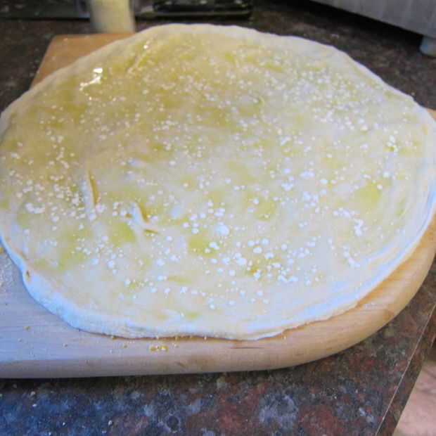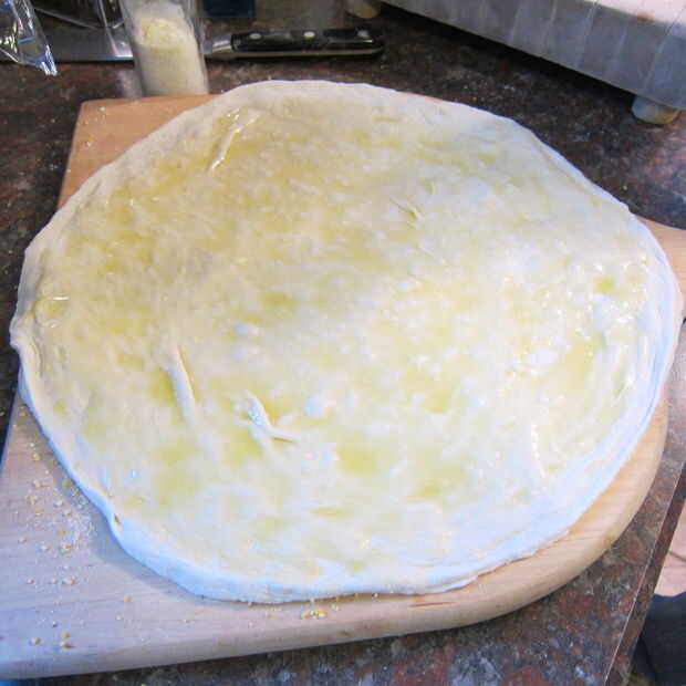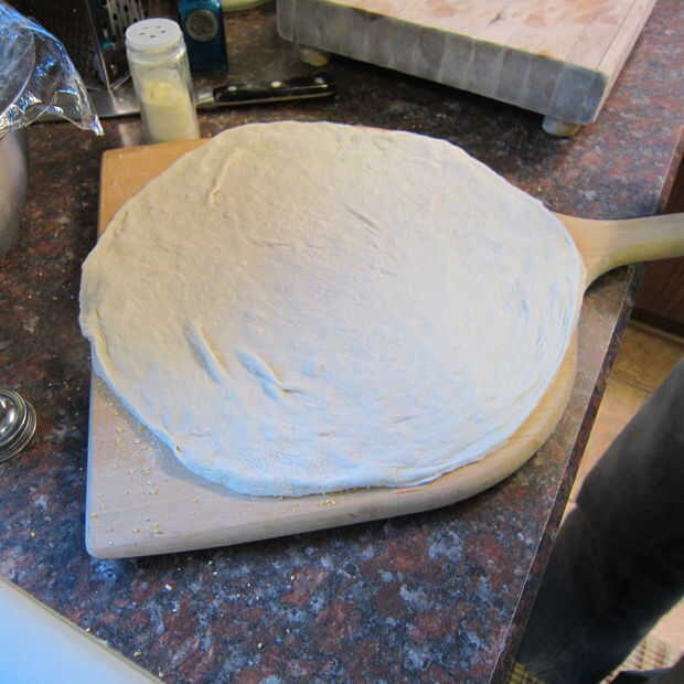 Una vez que la masa se extiende a unas 12 pulgadas de diámetro colocado en una pizza pelar generosamente espolvoreado con harina de maíz orgánica gruesa. Se puede utilizar harina normal si no tienes grueso pero solo uso harina como último recurso. Es difícil trabajar con. Si consigues una pizca apenas de agujero detrás juntos.