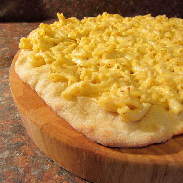 Sacar del horno y unte la masa con mac n' queso. Hornear otra vez durante aproximadamente 10 minutos o hasta que la masa esté dorado. No hornear más o la pasta se pone dura.