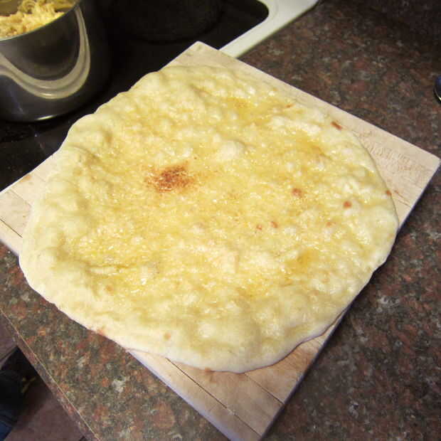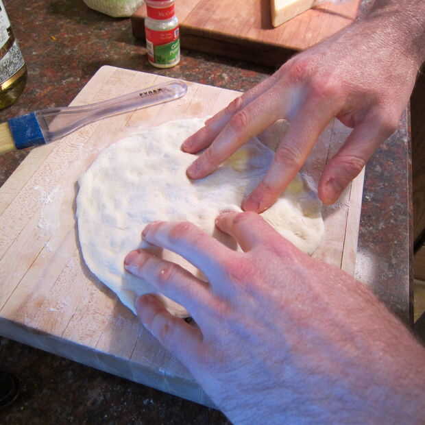 Suavemente Levante la masa y el uso de que las partes posterioras de las manos y dedos giran mientras tira suavemente la masa más grande. Tratar de mantener el grosor que incluso como puedas aunque lo más probable es que será imposible! No importa, sólo lo hace más rústico y casero.