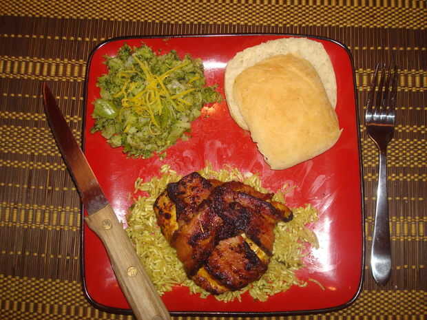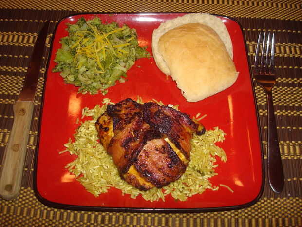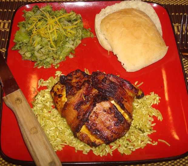 Servir la comida con 2 1/2 tazas frito Rice-A Roni y levadura de cena un rodillo para cada persona. Los rollos congelados funcionará muy bien y sólo toma 5 minutos al calor. Esta comida es sencilla y los ingredientes utilizados son rectos de la despensa, nevera y congelador.