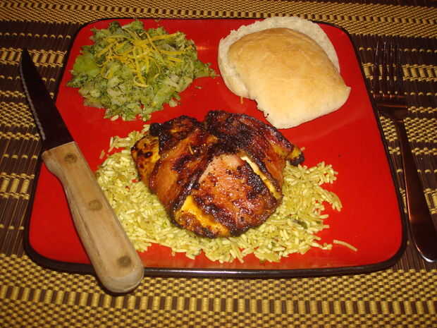 Precaliente la parrilla a 350 grados F. mezcla todos ingredientes en un tazón de tamaño mediano de la frotación y dejar a un lado. Limpiar 4 pechugas de pollo sin piel. Colocar las pechugas de pollo en una hoja de papel de aluminio y generosamente frote el pollo con el sazonador de carne, repetir en ambos lados del pollo. Envolver las pechugas de pollo frotadas con dos rebanadas de tocino en lonchas gruesa sazonado con pimienta. Poner su frotó, tocino envuelto pechugas de pollo a la parrilla, parrilla de ambos lados de al menos 9 minutos por cada lado. El tiempo de cocción puede variar dependiendo de la altitud. (De la parrilla hasta que el pollo esté bien hecho y dentro de la temperatura de 165 grados F.)