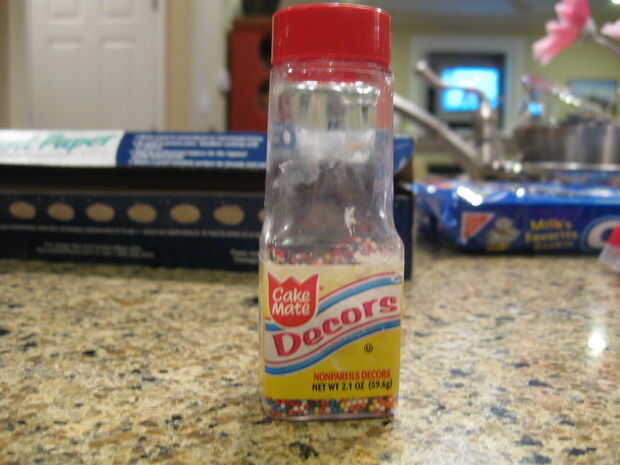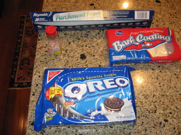1. A package of Oreos 2. capa de corteza de chocolate de su elección 3. una hoja de papel sulfurizado (papel encerado) 4. chispitas (opcionales) 5. un tazón de fuente 6. una cuchara de madera 7. microondas (no fotografiado)